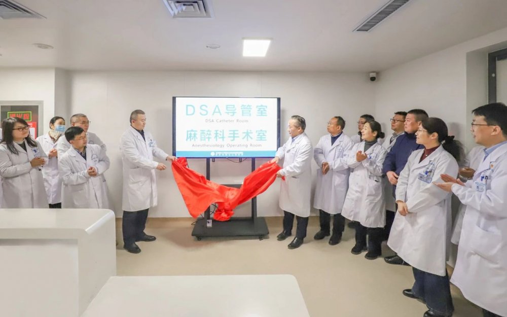 党委书记王为民和院长陈效友共同为新建DSA介入导管室、麻醉科手术室启用揭牌。