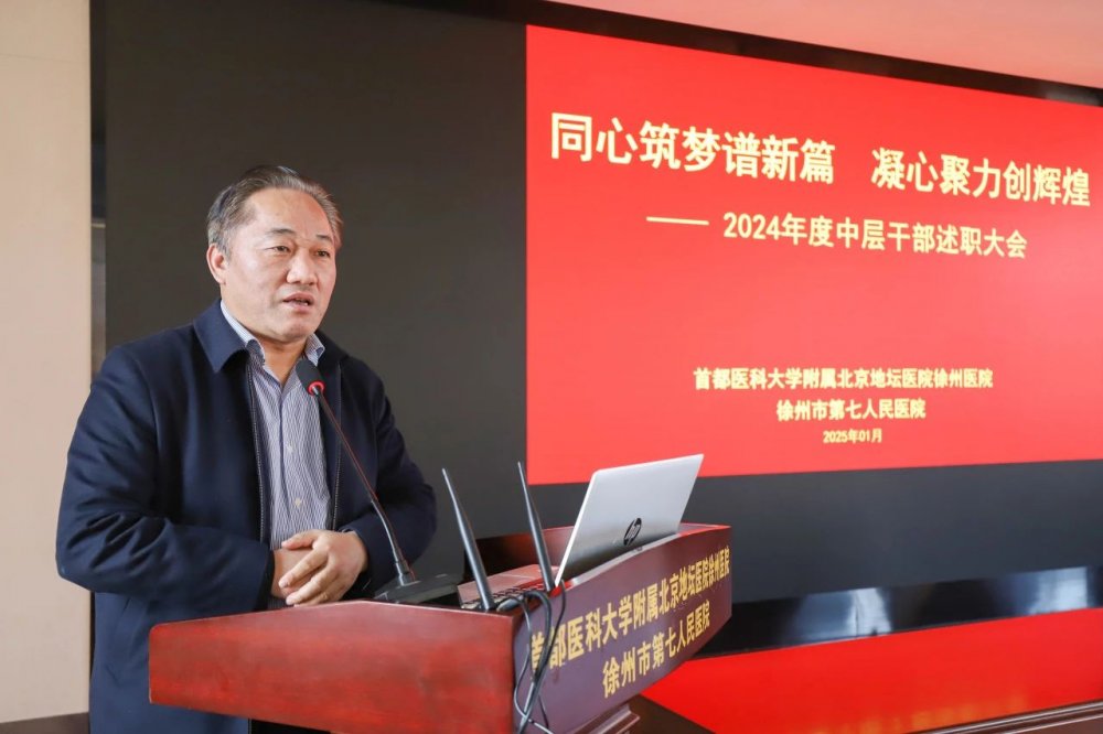 在讲话中,院长陈效友回顾了国家区域医疗中心建设一年的历程。他指出,一年来,在市委市政府的高位调度下,在北京地坛和徐州院区干部职工的共同努力下,医院在综合管理、学科发展、技术引进、基础建设等方面均取得了明显的提升。2024年已经圆满结束,面对充满挑战的2025,我们不仅要低头拉车,更要抬头看路。本次述职是一次展示、交流、互鉴的机会,希望大家展示成果,展现精气神,以更高的政治站位、更高昂的精神姿态、更务实的工作作风探索更加美好的2025。