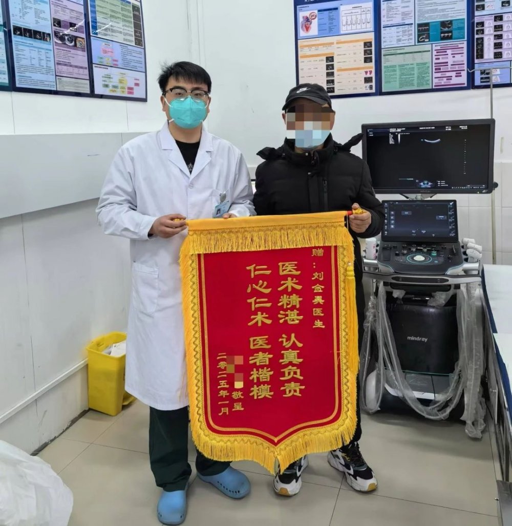 刘金昊是北京地坛医院徐州医院(徐州七院)超声医学科的一位主治医师。1月7日上午,他像往常一样坐在设备前为患者做超声检查。突然诊室门被推开,刘金昊下意识地说了句“有病人,请按号检查”,门又被合上了。过了一会儿,就诊的患者检查结束,刘金昊叫号下一位,结果一位手拿锦旗的男士走了进来。刘金昊先是一愣,随后认出这是之前自己接诊过的患者张先生。