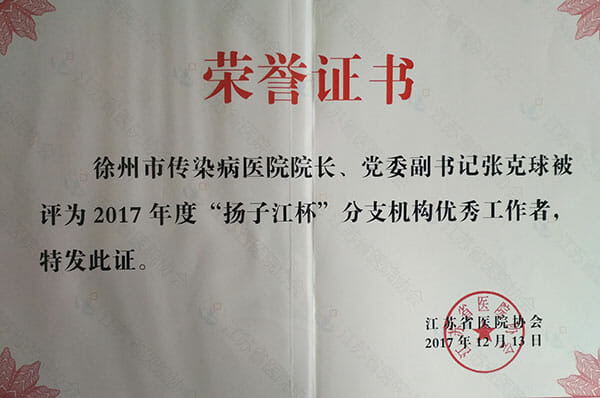 在江苏省医院协会第十六届医院院长论坛暨2017年学术年会上,徐州市传染病医院院长、党委副书记张克球同志荣获2017年度“扬子江杯”分支机构优秀工作者称号。