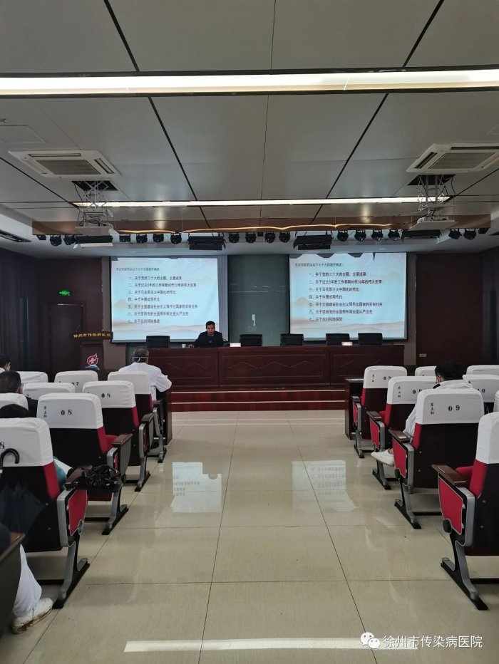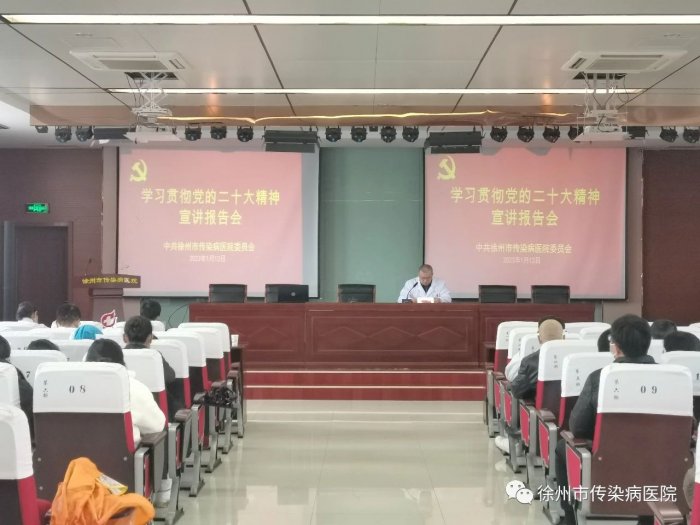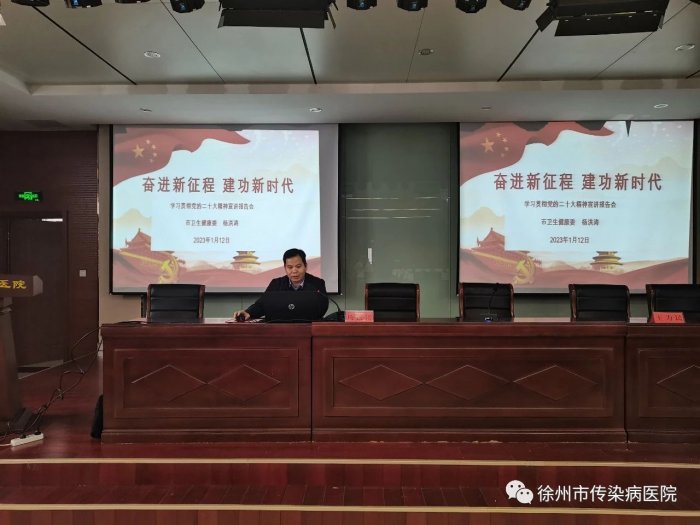 为全面深入学习领会党的二十大精神,1月12日下午,徐州市传染病医院特邀徐州市卫健委党委委员、副主任、三级调研员杨洪涛同志来院作党的二十大精神宣讲报告。会议由院党委书记王为民主持,院班子成员、中层干部、党员等共70余人参加。