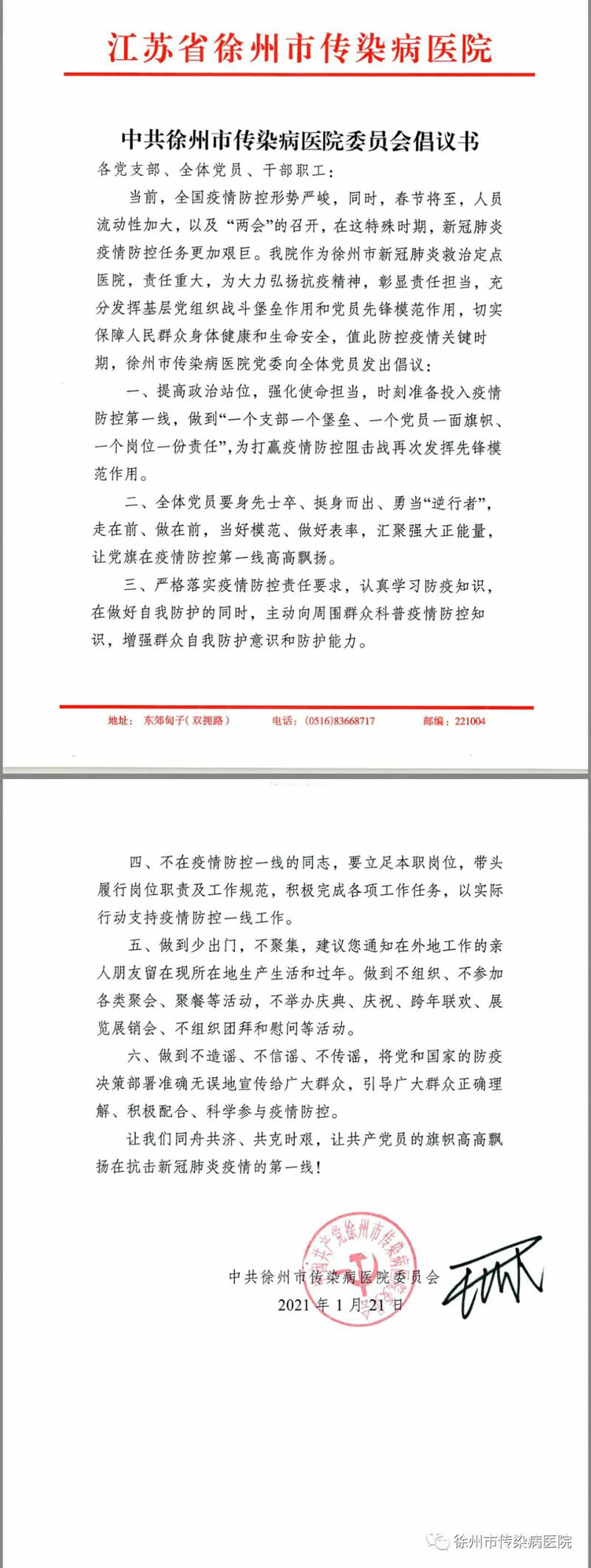 中共徐州市传染病医院委员会倡议书