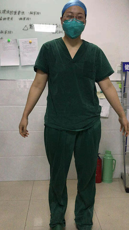 1994年出生的李雨佳是我们重症监护室最年轻的护士,也是我们医院疫情防控一线最年轻的护士。我印象中,她特别幽默风趣,经常调侃自己“90后的人有颗80后的心”。随着疫情防控形式的严峻,一线的我们都忧心忡忡,她却特别乐观,经常反过来开导我们这些姐姐们。微胖的她穿上三层防护服、戴上口罩,周身上下经密不透风,脑顶的汗无数次沿着后脑勺顺着后脖颈一直滑向后背,然后戛然而止被贴身的洗手衣所吸收,6个小时下来,她的洗手衣已经完全被汗水浸透。更要命的是,厚厚的防护服对“胖子”尤其不友好,它会随着你的呼吸,反复充气泄气,让你喘气异常吃力,如同敌人扼住你的肺,让你在窒息的边缘徘徊。经常下班,我们的“开心果”都会埋怨一通,但是隔天上班又跟打了鸡血一样勤奋能干。