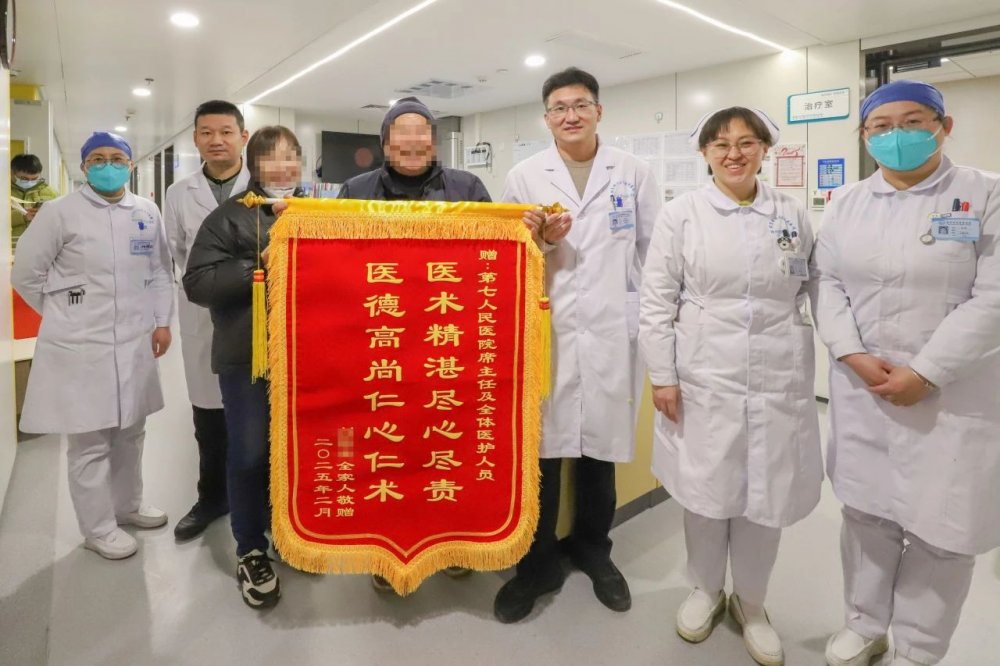 很快,病情稳定,到了出院的日子,2月6日上午,刘老太的家属来接其出院,一起带来的,还有一面送给席向宇和全体医护人员的锦旗。据家属说,这些都是刘老太一早就安排的。临走的时候,刘老太有点舍不得走,她说“这里有家的感觉,我在这里很安心”。