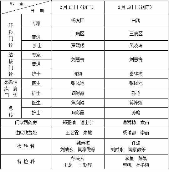 2018春节门诊各科室排班表