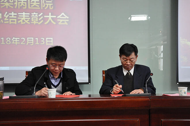 下午13:30分,大会正式开始。首先,张克球院长代表院领导班子,向过去一年为医院改革发展稳定立足本职岗位,任劳任怨、辛勤工作的全院干部职工表示衷心的感谢和诚挚的问候!回顾2017年,全院干部职工协同共进,锐意进取,围绕创建“三甲”医院的总目标,全面优化落实综合医改各项工作,进一步规范医疗行为,强化医疗质量,开展优质服务,完善服务措施,医院各项工作取得显著成绩。