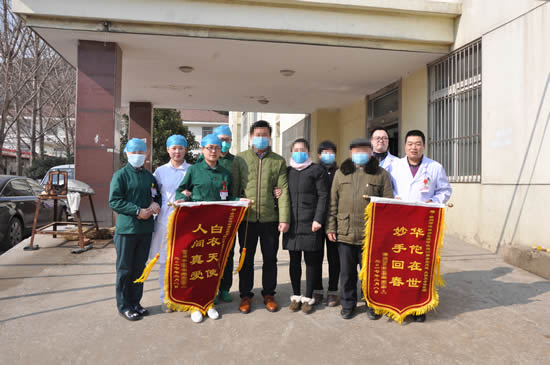 2月9日,这一天对患者和家属来说好像等待了太久,当医生前一天告知患者可以出院时,家属拉着医生的手不停的感谢。早上家属带来了患者的新衣服,早早的等在ICU科室的门口,一次次的向病房张望,当患者在护士的带领下出现在门口时,他的妻子冲到眼前,紧紧的抱住了丈夫,千言万语尽在不言中。家人把两面锦旗送到医护人员手中,这就是对我们工作最好的认可。
