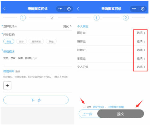 患者在病情描述界面选择就诊人,然后填写咨询目的和症状描述(至少输入10个字), 可通过添加图片功能上传检查、检验报告单,最后点击下一步,选填既往史、婚育史、过敏史、家庭史、个人习惯等信息最后点击提交。