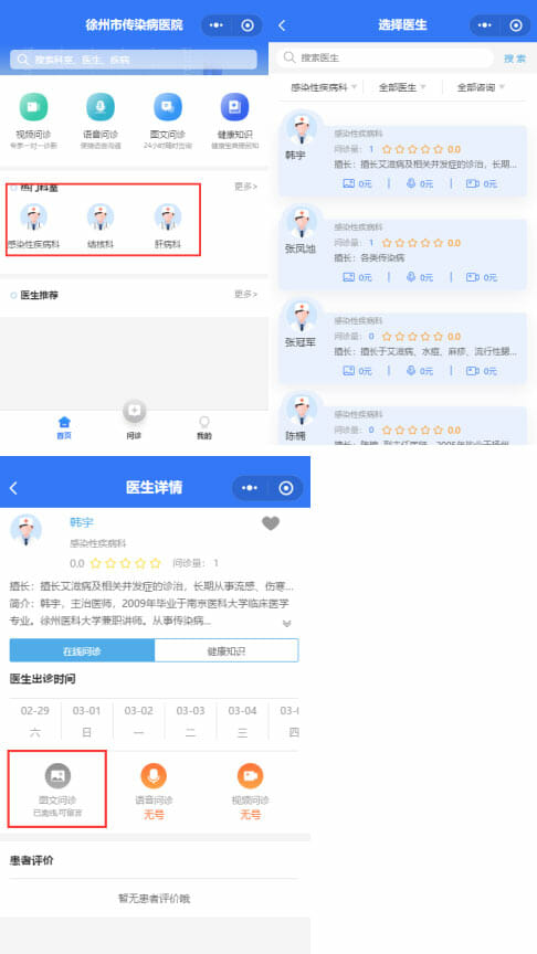 为贯彻落实国家及江苏省有关新冠肺炎防治的工作要求,徐州市传染病医院上线了线上问诊系统,医院感染性疾病科、结核科、肝病科的13名专家排班“线上坐诊”, 为广大患者提供咨询指导等医疗服务,减少患者来医院就诊风险。为保证问题回复质量,这些专家均拥有副高以上职称,临床经验丰富,能及时回应患者关切。