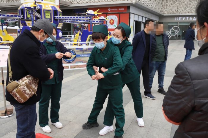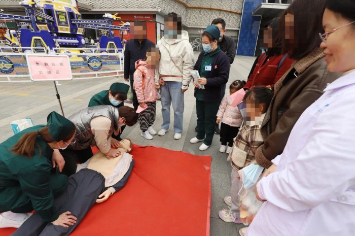护理人员现场为市民免费测血压、指脉氧监测,并示范教学心肺复苏、海姆立克等急救技能,吸引了不少群众的参与。