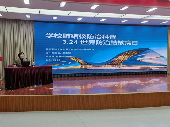 在第29个世界防治结核病日来临之际,中国防痨协会 学校与儿童结核病防治专业分会委员、北京地坛医院徐州医院(徐州市第七人民医院)结核三科主任刘慧梅,应邀走进徐州工业职业技术学院、江苏师范大学科文学院,为 700余名师生开展校园结核病科普讲座。