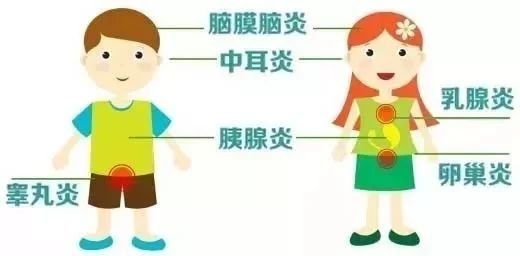 腮腺炎病毒除侵犯腮腺外,还可能侵犯神经系统及各种腺体组织,引起儿童脑膜炎、脑膜脑炎,青春期后可引起睾丸炎、卵巢炎和胰腺炎等。大多预后良好,死亡率低,死亡病例主要是重症腮腺炎病毒性脑炎所导致。