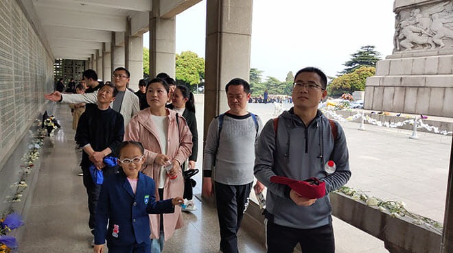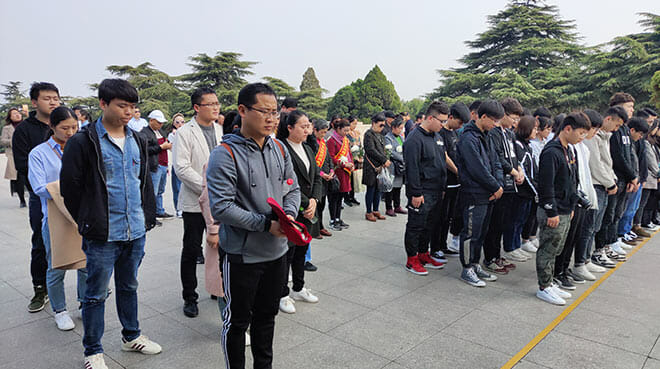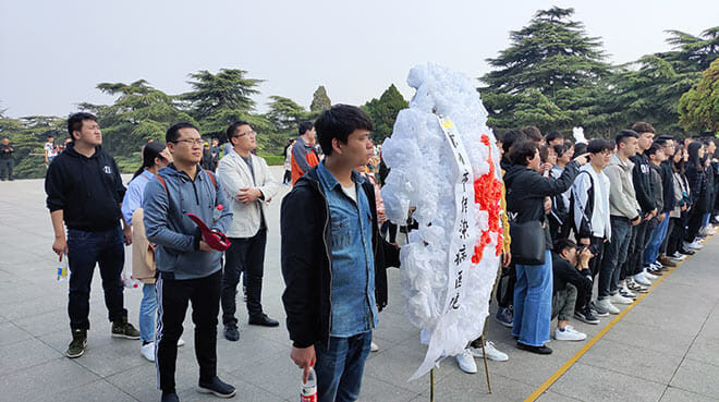 在院团委书记苏珂副院长的带领下,全体人员怀着崇敬心情,神情肃穆,拾级而上,在塔碑前奏唱国歌、敬献花圈、重温誓词、默哀悼念,随后绕塔瞻仰烈士英名录,参观淮海战役烈士纪念塔及国防教育馆。
