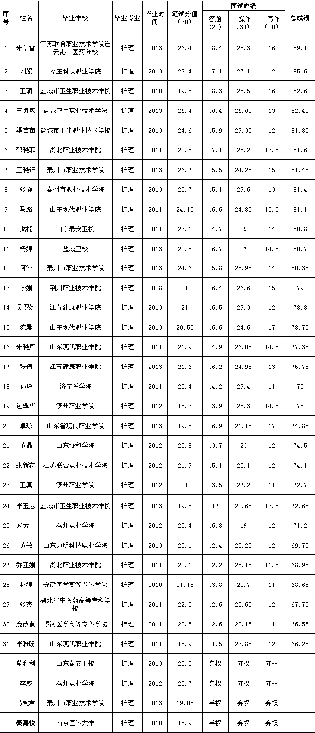 徐州市传染病医院2013年招聘合同护士成绩公布