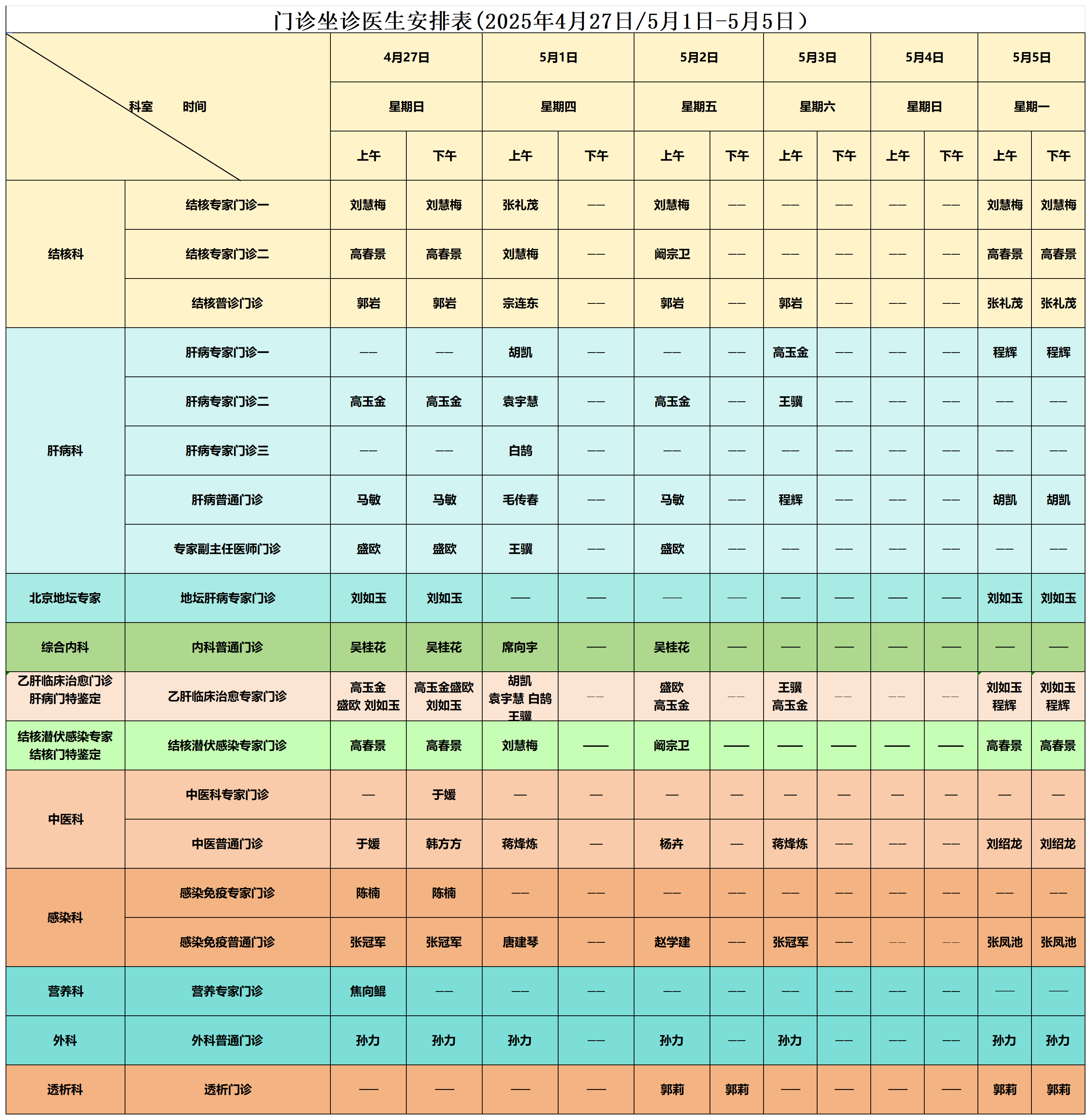 根据国家相关规定,结合医院的具体情况,经医院研究决定,徐州市第七人民医院劳动节假期安排如下:劳动节放假时间为5月1日至5月5日,4月27日(周日)正常上班,放假期间门诊和医技科室正常开诊,具体坐诊安排见下表。