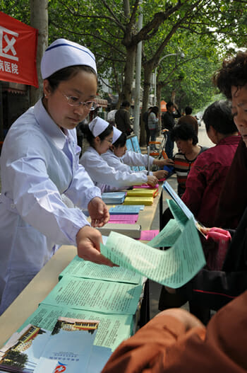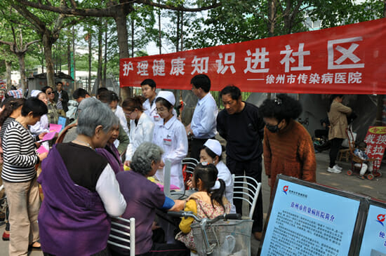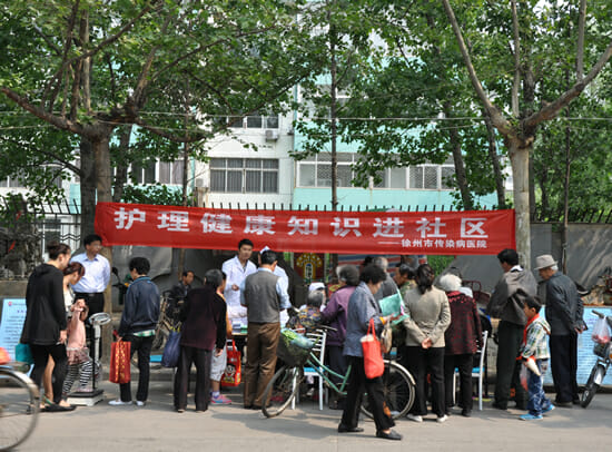 2013年05月04日,值“5-12”国际护士节来临之际,为进一步提高社区居民对传染病的预防和自我护理能力,徐州市传染病医院在黄山社区举办第二届“护理健康知识进社区”活动。医院10余名医护人员及青年志愿者来到老百姓的身边,为社区居民宣传常见慢性病、传染病的防治知识,介绍如何通过健康的生活方式和行为抵御和控制常见病、传染病的相关知识。
