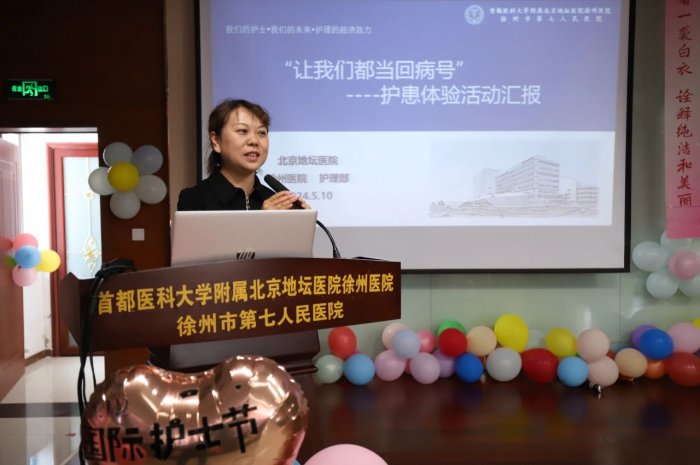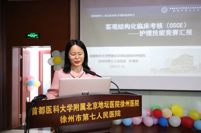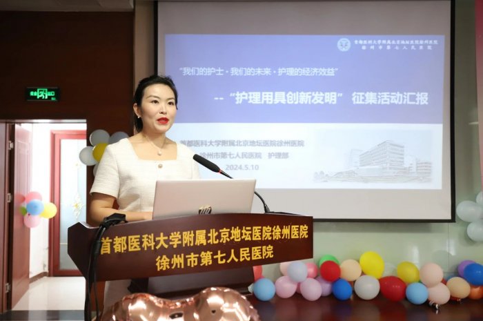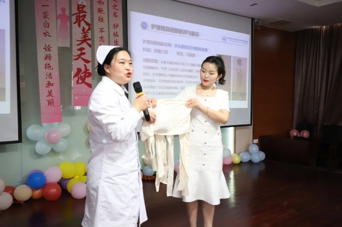 护理部主任张俊霞、逯艳丽、护士侯文玉、许洁分别对护患体验活动、护理技能竞赛、护理用具的改良和发明等活动情况进行汇报或展示。
