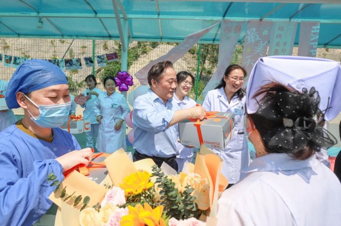 微风拂过初夏的湖畔,吹响第一声蝉鸣。在第113个“国际护士节”来临之际,为弘扬南丁格尔精神,关爱临床一线护理人员,5月10日上午,院长陈效友、党委书记王为民带领全体班子成员,亲切慰问临床一线辛勤工作的护理人员,为她们送去节日祝福和美味蛋糕,把节日最美的祝福送给最美的护理工作者。