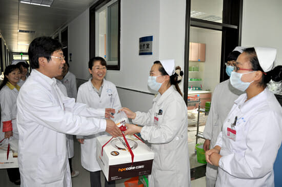 值“5.12”国际护士节来临之际,徐州市传染病医院张克球院长带领院领导班子及职能科室负责人一行十余人,深入临床一线,亲切慰问辛勤工作的护理工作者,为她(他)们送去香甜可口的蛋糕以及节日的祝福。