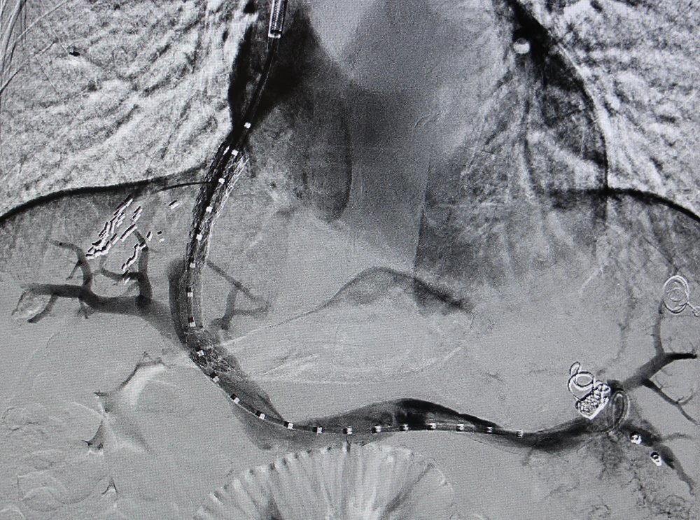 5月15日,手术按计划进行,在卜高峰及其团队的配合下,张明主任首先经颈静脉穿刺,引入导管至肝静脉,随后在DSA影像引导下精准穿刺肝内门静脉分支,建立肝静脉-门静脉通路。导丝通过后,球囊扩张分流道,并成功植入覆膜支架,用一根导丝,在患者肝脏内架起了一座生命“立交桥”,整个手术历时不到1小时。术中患者处于清醒状态,无明显不适,术后患者门静脉压力显著下降,生命体征平稳。