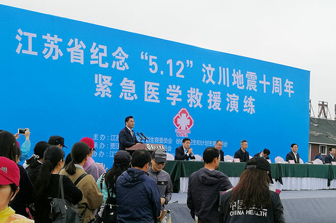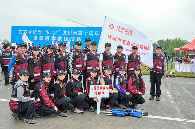 5月11日,由江苏省卫生计生委、徐州市卫生计生委主办的“江苏省纪念’5.12’汶川地震十周年地震灾害紧急医学救援演练活动在徐州市贾汪区凤鸣海公园举行。