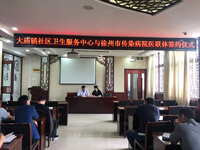 2019年5月15 日,徐州市传染病医院郇业青副院长带领感染性疾病科张凤池主任、结核科刘慧梅主任、外联办等一行数人来到经济开发区大庙卫生服务中心,签约“医联体”建设合作单位。大庙卫生服务中心的刘杉副院长对徐州市传染病医院一行人员的到来表示欢迎。