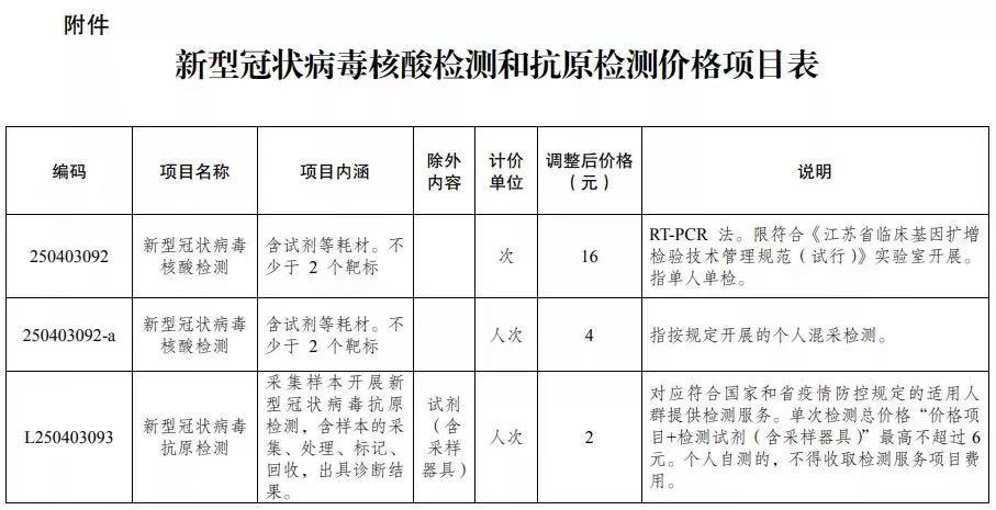 根据江苏省医疗保障局、江苏省卫生健康委员会《关于进一步降低新型冠状病毒核酸和抗原检测价格的通知》医保办发〔2022〕35号