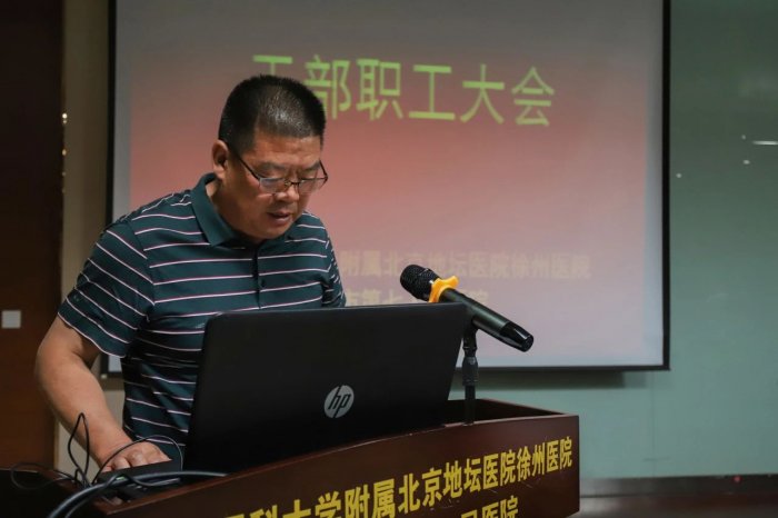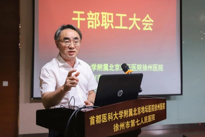 6月7日下午,首都医科大学附属北京地坛医院徐州医院(徐州市第七人民医院)召开干部职工大会。徐州市卫生健康委员会党委书记、主任黄广振,总院北京地坛医院党委副书记、院长金荣华,徐州市卫生健康委员会党委委员、副主任曹永,徐州市卫生健康委员会四级调研员、医政医管处处长高行群,医院党政班子成员、中层干部、护士长以及职工代表参加会议。