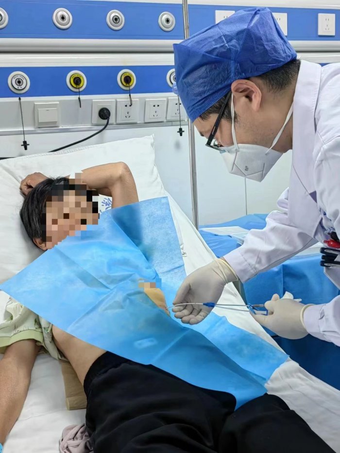 下午2时,在与彩超医生进行充分沟通后,高春景找到相对安全的穿刺点。消毒、铺巾、麻醉、操作,一气呵成,很快,引流管已放置完成,心包腔积液抽取成功。目前该患者胸部闷胀感明显缓解,饮食改善,生命体征平稳,虽携带引流管,但平时可自主下床活动,不受影响。