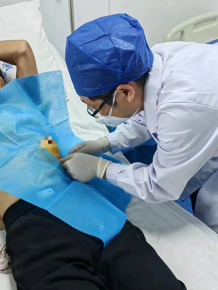 入院后,患者心包积液持续增多,导致其饱胀感明显,吃饭较差,精神状态不佳。最好的方式便是进行心包穿刺。但此时正处端午假期,为尽快解除患者痛苦,高春景放弃休息,认真查看了患者的胸部CT 及心脏彩超,最终决定对患者进行床旁心包腔穿刺引流。