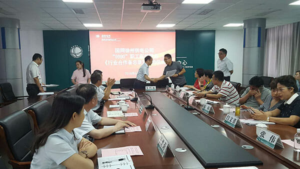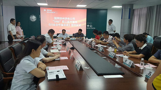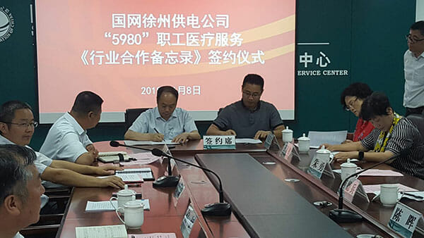 国网徐州供电公司为深化公司“5980”职工服务工程,精准服务职工所需,2018.6.8下午,国网徐州供电公司在其健康服务中心与徐州市中医院、徐州市妇幼保健院、徐州市儿童医院、徐州市口腔医院、徐州市公共卫生医疗中心(徐州市传染病医院)、徐州市东方人民医院六家专科医院举行医疗服务签约仪式,徐州市卫计委工会主席何德兵、副主席陈晖、国网徐州供电公司纪委书记、工会主席赵广周、健康服务中心领导班子及相关部门负责人出席了签约仪式,苏珂副院长代表我院参加了此次签约活动。