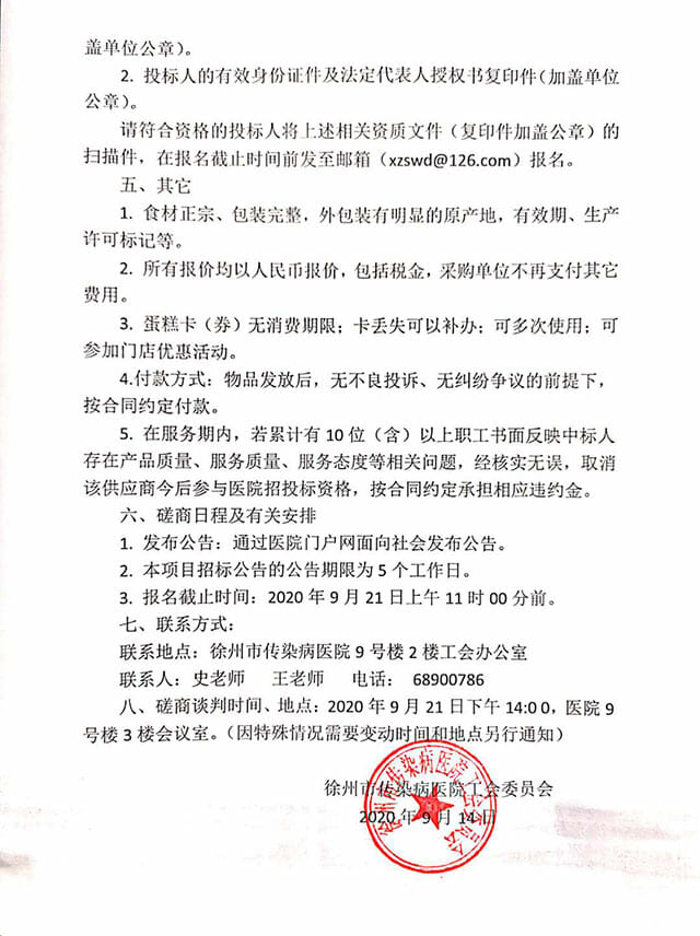 依照苏工发【2018】13号关于印发《江苏省总工会关于贯彻落实全国总工会基层工会经费收支管理办法的实施细则》的通知文件精神,经研究决定,拟于近期对徐州市传染病医院职工生日蛋糕卡(券)采购项目进行磋商谈判。欢迎具有法人资格和相关行业资质的供应商参与磋商竞标,本次采购项目内容如下: