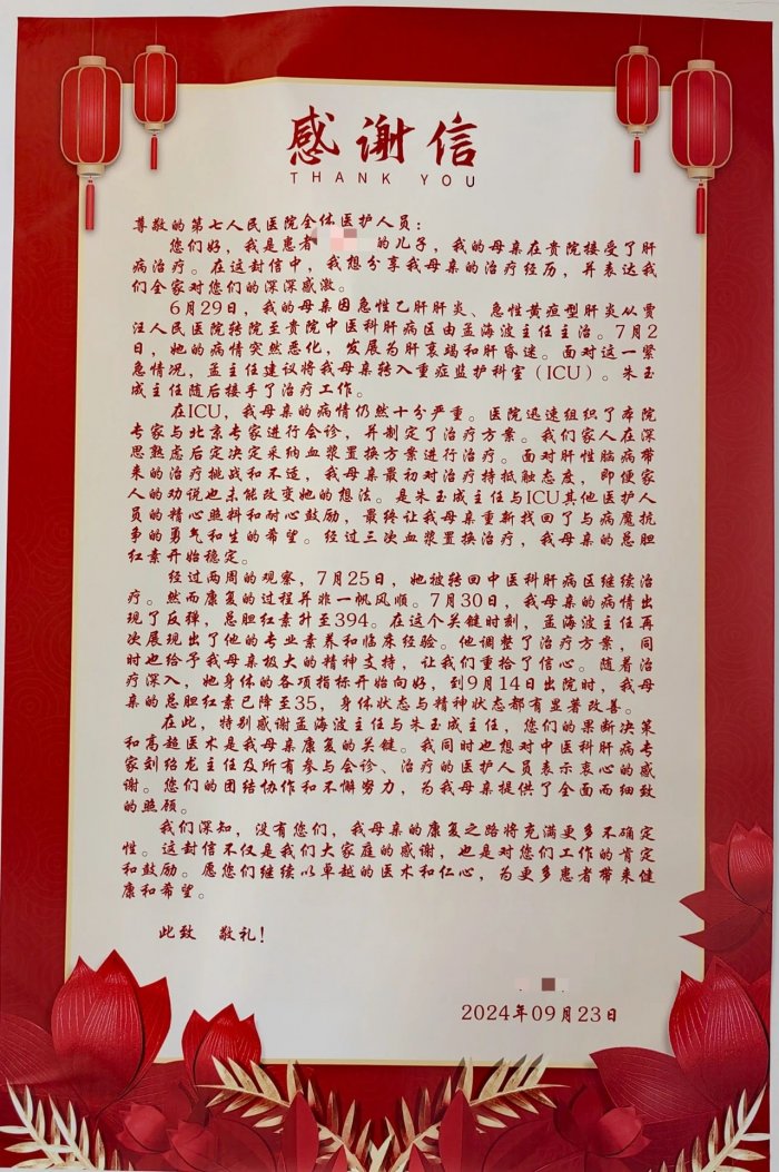 经过中医科、重症科与北京专家多番会诊讨论,最后确定通过血浆置换方案进行治疗。经过ICU的精心照料和耐心鼓励,患者产生了极大的勇气和生的希望,积极配合治疗方案。两周后,患者病情恢复稳定,7月25日从重症监护室转回中医科接受后续治疗。在中医科,医护人员为患者提供了全面、专业、细致照顾和中医特色治疗,正是有中西医双剑合璧,把患者从死亡边缘上拉了回来。