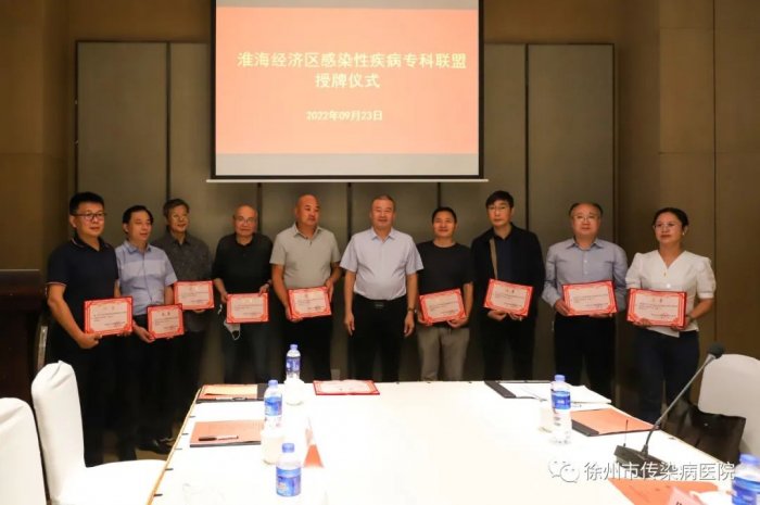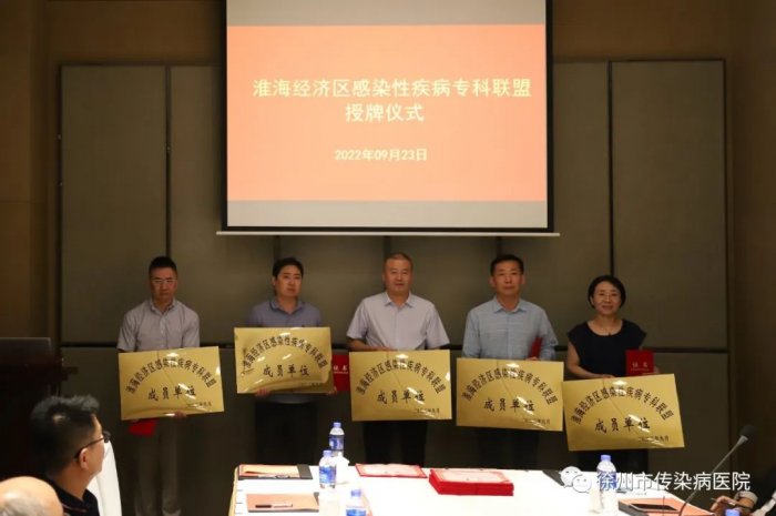 会议还进行了联盟成员单位授牌仪式。徐州市传染病医院成为淮海经济区感染性疾病专科联盟理事长单位;徐州医科大学附属医院、淮安市第四人民医院、河南省商丘市立医院、安徽省蚌埠市第五人民医院成为副理事长单位;徐州市第一人民医院、南京鼓楼医院集团宿迁市人民医院、安徽省淮北市传染病医院、新沂市人民医院、睢宁县人民医院、邳州市人民医院、丰县人民医院、沛县人民医院等为常务理事单位。