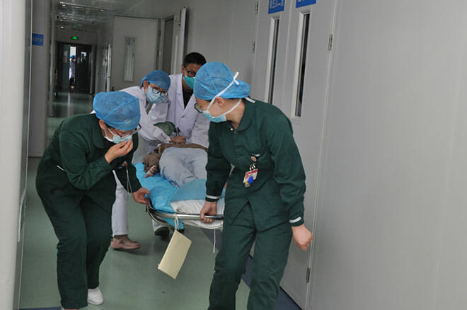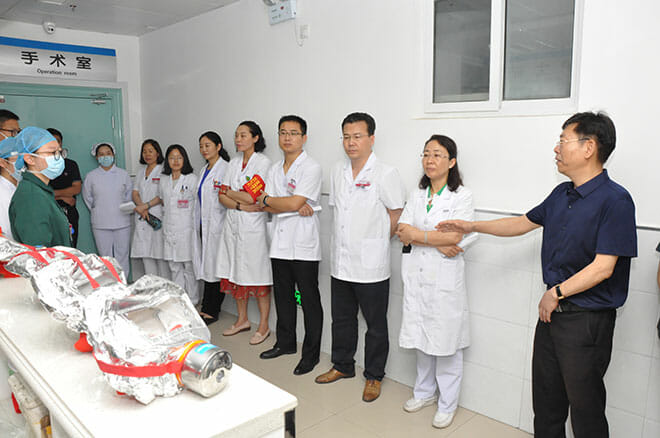 张克球院长到会并对全院的消防安全工作提出了要求,要求全院职工要利用开展“安全生产月”的契机,开展安全隐患排查整改工作,落实安全生产责任制,做好夏季消防安全工作。演练现场在张克球院长宣布“演练开始”一声令下,ICU病区医务人员在朱玉成主任、张军玲护士长的指挥下按“消防预案”开始了“灭火及人员疏散演练”,报警组、灭火组、疏散组迅速到达指定位置,报警人员向指挥组报告火警情况,值班护士关闭氧气、断电,消防控制室立即启动火警警笛、消防广播、排烟系统,灭火组迅速戴上消防自救呼吸器,拿着灭火器赶赴事发部位进行灭火、疏散组配合医务人员进行病人疏散,演练过程分工明确,井然有序。