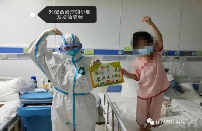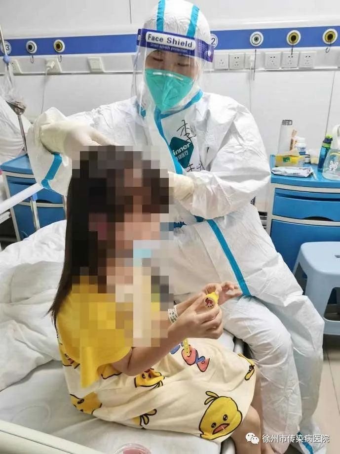 5.生病也要美美哒每个孩子都是被天使亲吻过的精灵。看到漂亮的小姑娘散着头发,心灵手巧的“大白们”坐不住了,特意申请了彩色的皮筋,给小姑娘编了一个美美的发型,看着孩子们纯真可爱的笑脸,再苦再累也值了。