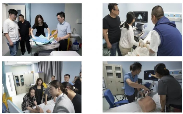 张瑶主任对线上和线下学员提出的问题进行了现场解答并带领学员们走进介入诊室进行超声引导下穿刺实操,由副主任医师杨学平、王雪梅以及主治医师单涛、王玥手把手指导大家实际操作,提高了学员的实战技能。