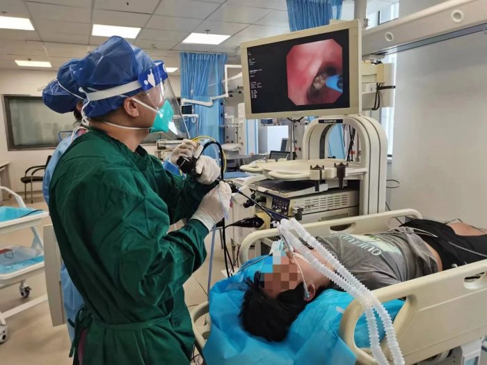 在这种情况下,必须先清理坏死物。经过商讨,内镜中心医护团队联合麻醉师开展了无痛支气管镜下冷冻联合氩气刀热消融治疗术治疗,用氩气刀烧灼坏死物,冷冻冻切及反复钳夹焦痂及坏死物,气管狭窄改善。术后患者胸闷等不适明显改善。