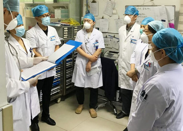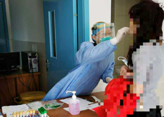 主治医师查看患者病情,追问入院前后的行踪及为患者采集咽拭子