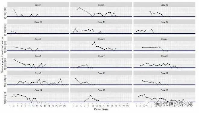 4、新冠患者的间歇性排毒:新加坡的医生在著名医学期刊《美国医学会杂志》(The Journal of the American Medical Association, JAMA)发文,总结了新加坡18例患者的临床特征,他们发现有一些患者,在发病的后期,病毒的载量是逐渐下降的,但是一部分患者,出现了间歇性排毒的过程。下面这张图就是报道患者的核酸检测结果,横坐标是时间,纵坐标是PCR反应的CT值。