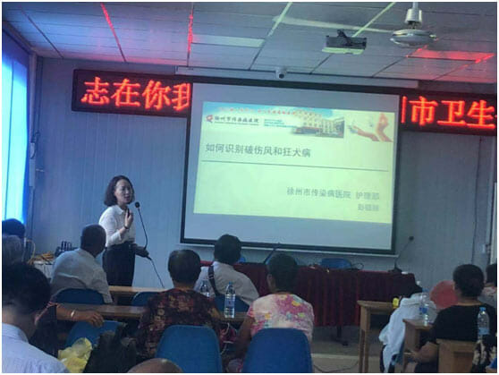 为认真贯彻落实关于新时代文明实践中心建设工作的指导意见,按照市卫健委新时代文明实践中心志愿服务活动的精神要求,利用市区丰富的医疗资源,深入基层服务群众,7月23日,时值大暑,我院志愿者服务队同委机关第二党支部,走进铜山茅村镇卫生院,面对所辖各村卫生室工作人员及周边群众,开展了以“夏季高发传染病”及“狂犬病和破伤风的防治”为主题的健康教育咨询服务。