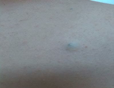 我看到肩膀上的肿块,高出皮面,表面发红光滑,中等硬度,有弹性,与皮肤有粘连,不易推动,无波动感,有触痛,顶部可见一个蓝黑色小点。凭着多年的外科临床经验,当时就给他下了诊断:皮脂腺囊肿并感染。
