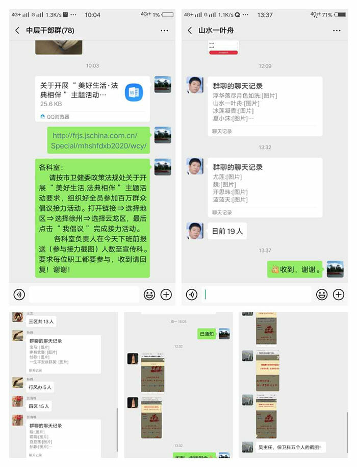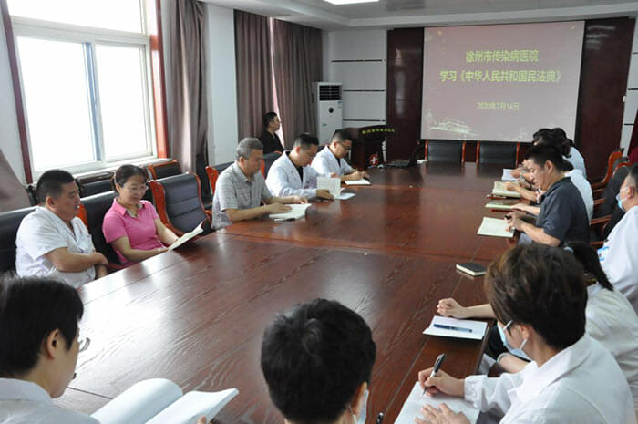 一是参加百万群众倡议接力活动。根据市卫健委政策法规处关于开展“美好生活·法典相伴”主题活动的通知要求,医院领导高度重视,精心组织,广泛发动,充分利用徐州市传染病医院微信公众号转发倡议接力活动链接,组织干部职工学习倡议书内容,全院四百余人参与完成接力活动,通过此活动进一步增强了干部职工“法律即生活,生活即法律”的意识。