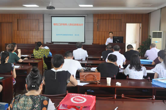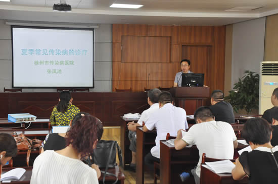 培训活动在紫庄镇卫生院领导的大力支持配合下有序开展,共有五十余人参加了这次培训。我院两位专家分别讲授了《慢性乙肝特殊人群抗病毒治疗》与 《夏季常见传染病的诊疗》。高玉金主任着重对慢性乙型肝炎的特殊患者,如儿童、妊娠、老年患者,或合并其他疾病状态的患者,以及HBV相关的失代偿肝硬化、肝衰竭、肝移植、肝细胞癌患者的抗病毒治疗方案的选择及治疗过程中需注意的问题进行了的详细的讲解。张凤池主任则就夏季常见传染病如流行性乙型脑炎、水痘、破伤风等疾病的传染源、传播途径、易感人群进行了耐心讲解,并着重对当季常见的肠道传染病如细菌性痢疾中的中毒性痢疾、慢性痢疾的病情观察、治疗等方面进行了更加细致的讲解。炎炎夏日,阻挡不了大家学习的热情,而两位专家的精彩授课更是赢得大家的一致好评。