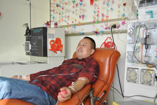 2014年10月9号,况开义乘坐高铁到达了北京空军总医院。为了能顺利地从外周血中采集出造血干细胞, 10号开始,医生便给况开义注射 “动员剂”,在这期间,一向身体强壮的他,也稍微感受到了肌肉酸楚,短暂无力的不适应症状。连续五天注射动员剂,抽血化验,他忍受着疼痛,希望把最健康的干细胞输送给患者。14号11点20分,开始了造血干细胞的采集,医生从况开义的手臂静脉处采集全血,通过血细胞分离机提取造血干细胞,同时将其它血液成份回输到他的体内。在此期间他要双臂伸直,不能打弯,一直保持这样的一个姿势。下午3点30分,历经近四个小时,共采集了196毫升造血干细胞。他忍受着长时间不能动弹的姿式,心里却是非常高兴的,因为他的无私付出,挽救了一个活生生的生命。
