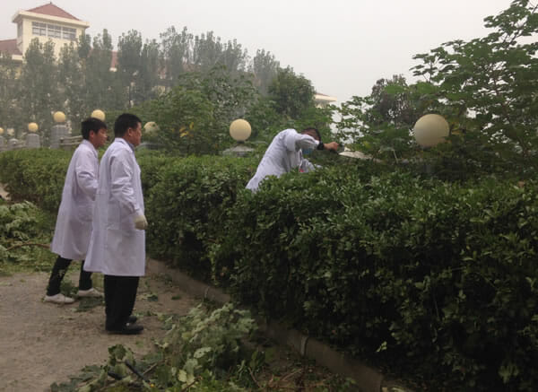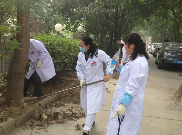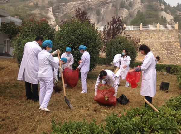 在姚副院长的领导下,大家开始了热火朝天的劳动场面。不怕脏,不怕苦,不怕累,埋头苦干。不论是铲、捡垃圾、捡烟头,还是割草、扫地,都配合的天衣无缝。你看,不一会儿,花圃里散乱的枝藤不见了,躲在缝隙里的垃圾清除了,攀附在树干的藤条也变得有条有理了。经过大家的齐心协力,整体的面貌焕然一新。