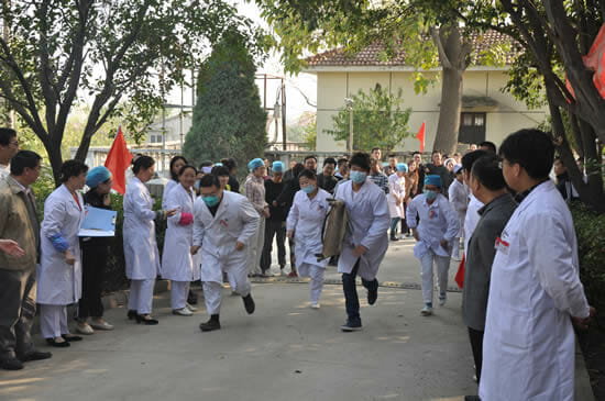 为深入开展“消防月”活动,进一步加强全院职工的消防安全意识,提升消防应急能力,徐州市传染病医院通过各种形式做好消防安全宣传工作,在医院内显著位置悬挂横幅、利用LED电子屏营造宣传消防安全氛围。邀请市防火办教官对全院进行了消防安全知识培训,并于2013年11月6日,在“11.9”消防日来临之际,举办了“2013年冬季消防运动会”,全院140余人分别进行了应急救援、灭火等科目演习,市卫生局领导到场进行了观摩指导。