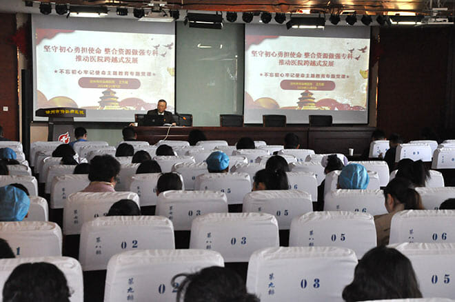 按照“不忘初心、牢记使命”主题教育总体要求,11月5日下午,徐州市传染病医院党委书记王为民同志以《坚守初心勇担使命--整合资源做强专科,推动医院跨越式发展》为题为全院党员干部上了专题党课,市卫健委党委主题教育指导组组长蒋明伟同志、医院领导班子全体成员、党员、积极分子共百余人参加。