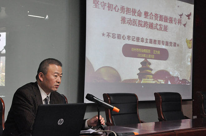 自“不忘初心,牢记使命”主题教育活动开展以来,徐州市传染病医院党委按照“守初心、担使命、找差距、抓落实”的总体要求,组织全体党员干部深入学习习近平新时代中国特色社会主义思想,不断强化政治立场,加强党性修养,聚焦群众关心的热点和医院发展的难点,不断将主题教育走向深处、走向实处。