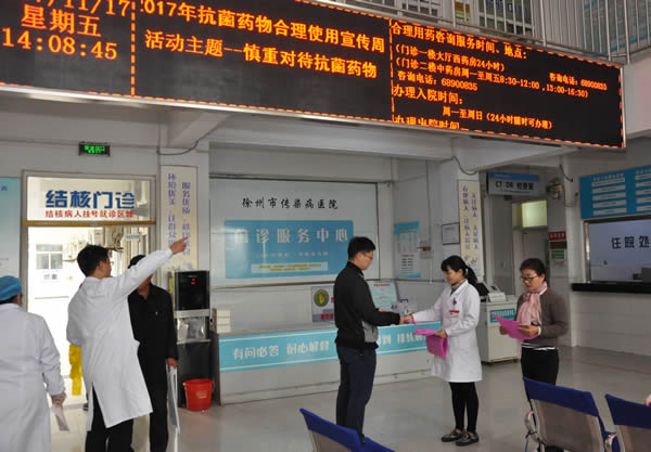 每年11月的第三个周是世界卫生组织确定的“抗菌药物合理使用宣传周”。2017年11月17日,徐州市传染病医院医务科、院感科、药剂科、宣传科等相关职能科室,在院内组织了一次抗菌药物合理使用宣传活动。现场为100余名市民进行了抗菌药物合理使用宣传讲解,发放宣传资料200份。同时临床药师对全院医师进行了《抗菌药物临床合理使用》专题讲座,通过宣传抗菌药物合理使用知识,提高社会公众和医务人员对细菌耐药危机的认识,牢固树立抗菌药物合理使用观念,减少不必要的抗菌药物使用,营造全社会关心、支持、参与抗菌药物合理使用的良好氛的围。